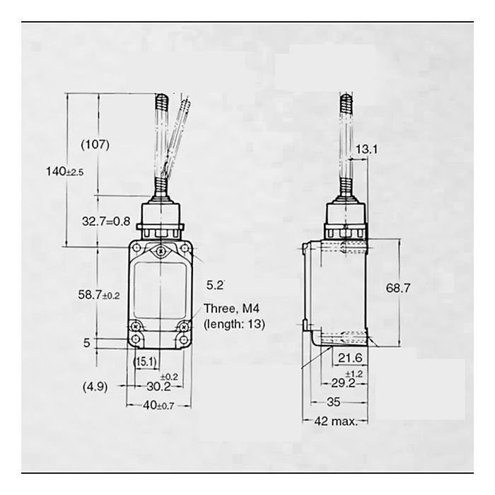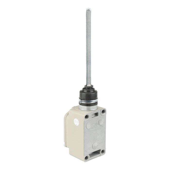 Limit switch con actuador tipo “bigote de gato” (varilla resorte). Se activa al flexionar la varilla en cualquier dirección (360°), ideal para detectar objetos que no tienen una trayectoria perfectamente alineada o con formas irregulares.