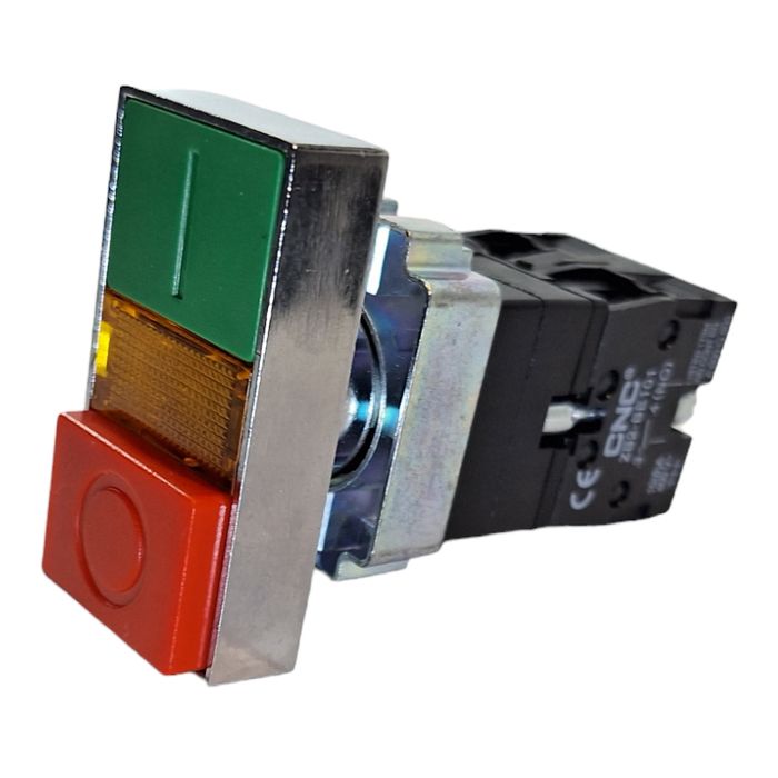 Botonera combinada que integra arranque (I), parada (O) y señalización luminosa en un solo dispositivo de 22mm. Ahorra espacio en el panel y simplifica el cableado de control de motores.