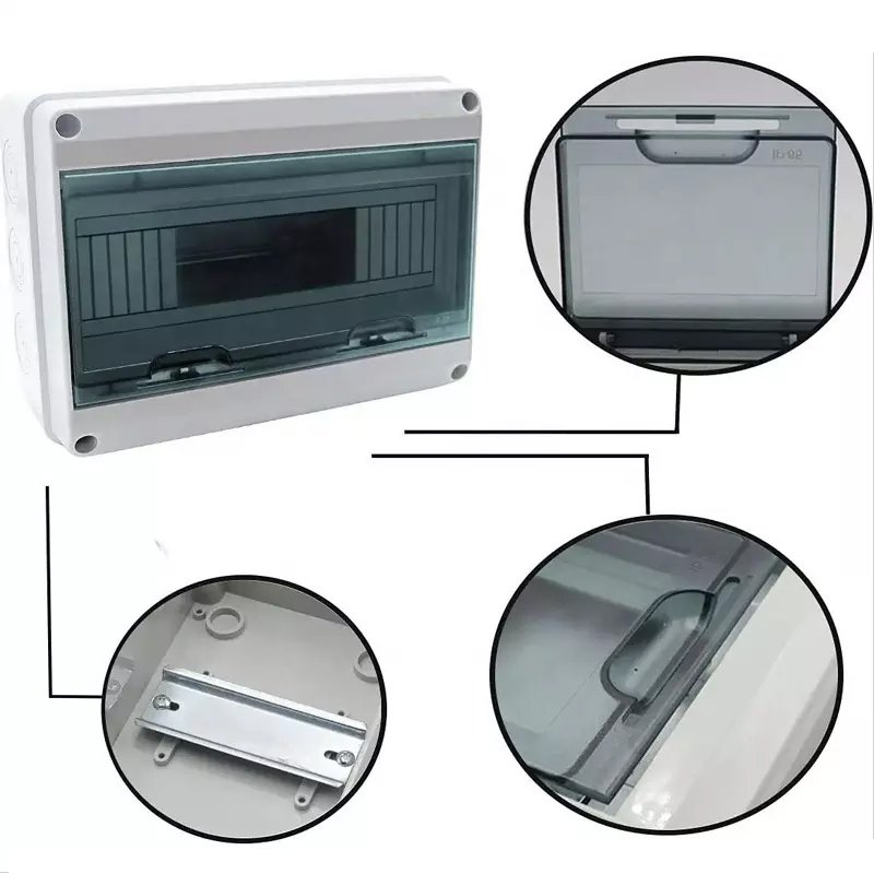 Tablero eléctrico de una sola fila extendida, permitiendo alojar hasta 15 módulos DIN. Su diseño hermético con sello de goma perimetral asegura la estanqueidad necesaria para instalaciones eléctricas seguras en condiciones ambientales adversas.